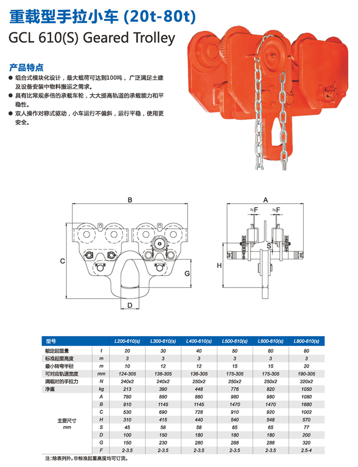 常規(guī)型手拉小車 GCL/GCT810系列小車選用了全新的高強(qiáng)度低合金結(jié)構(gòu)鋼,確保4倍安全載荷,輕巧、安全、安裝方便、是目前最為輕巧小車之一。 1.采用優(yōu)質(zhì)鋼材,結(jié)構(gòu)緊湊,外型美觀。 2.國(guó)際標(biāo)準(zhǔn)生產(chǎn),安全性能可靠。 3.可多種選擇,“H”型鋼、“I”型鋼均可適用。